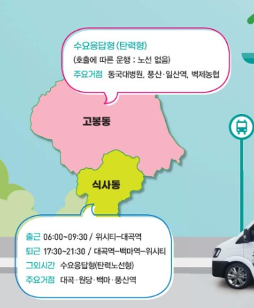 수요응답형 교통수단으로 앱을 통해 실시간 예약하고 원하는 시간 원하는 장소에서 이용가능한 새로운 대중교통 서비스입니다. 노선에 따라서 이용하는 것이 아닌 예약을 통해 나와 가까운 정류장에서 탑승하는 개념입니다. 특히 식사,고봉지역은 대중 교통 이용 수요가 일정하지 않고, 장거리로 인해 운행 노선이 적은 주민들이 교통 이용에 불편을 겪어왔이므로 수요응답형 교통 수단이 큰 힘이 될 것으로 보입니다.