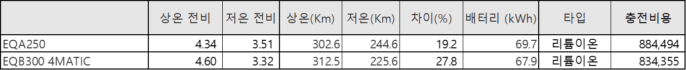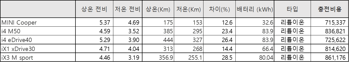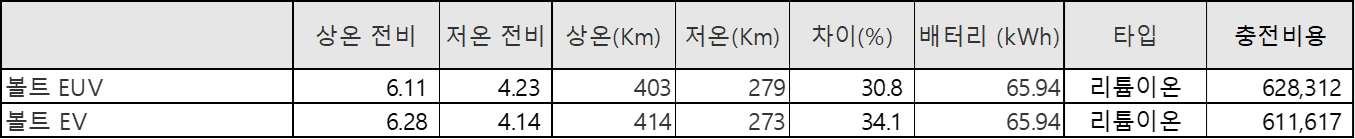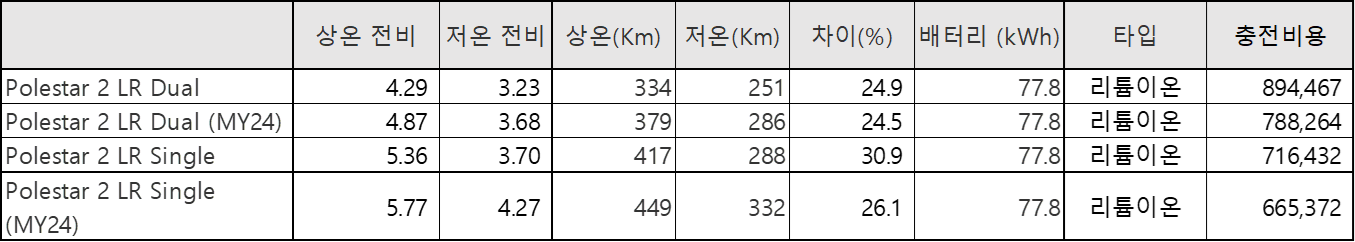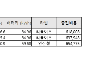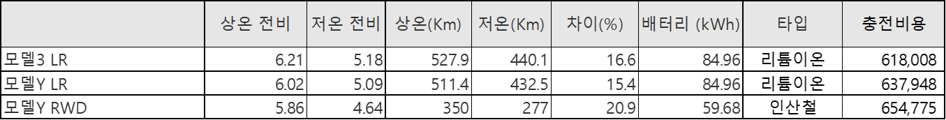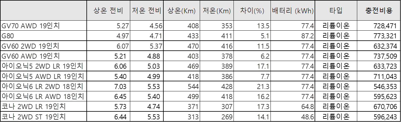 | ※ 아래 테이블에서의 전비 계산법 (모든 자료는 2023년 기준입니다.) A. 상온/하온 전비 = 상온-하온 최대거리 ÷ 배터리 용량 B. 충전비용 = 1년 평균 주행거리 (12,000 Km) ÷ 상온 전비 * 충전요금 (320원) |