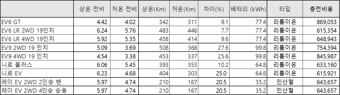 ※ 아래 테이블에서의 전비 계산법 (모든 자료는 2023년 기준입니다.) A. 상온/하온 전비 = 상온-하온 최대거리 ÷ 배터리 용량 B. 충전비용 = 1년 평균 주행거리 (12,000 Km) ÷ 상온 전비 * 충전요금 (320원) |