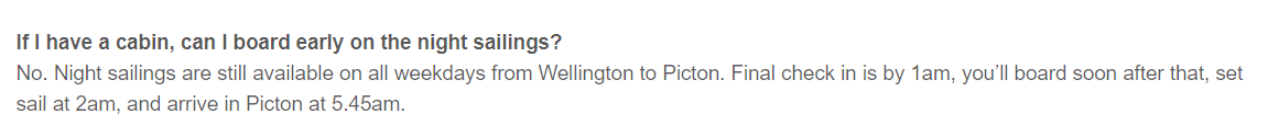 새벽 2시 출발 페리를 직접 이용한 경험으로는 생각보다 늦은 탑승시간으로 인해 이용가능한 Cabin 시간이 3시간 가량 밖에 되지 않았고 그 피로감과 픽턴에 내려 새벽 6시에 이동시에 어두운 도로 사정으로 운전이 어려운 점이 추천을 하기에는 어려웠던 경험이었습니다.