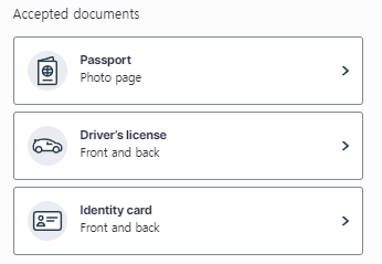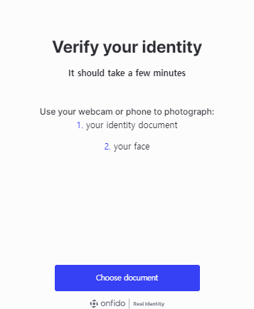 5) 이제 너의 신원을 확인을 할 텐데 준비물은 웹캠 혹은 스마트폰이 필요합니다. (신분증과 본인의 얼굴을 촬영할 것이라고 알려줍니다.) "Choose document"를 누릅니다.