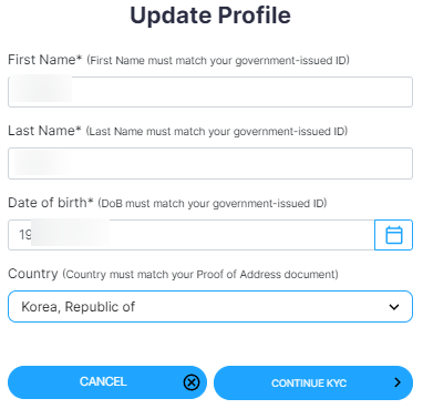 4) "Start now"를 눌러주면 아래와 같이 개인정보를 넣는 팝업이 나오고 입력 후 "Continue KYC"를 눌러줍니다.