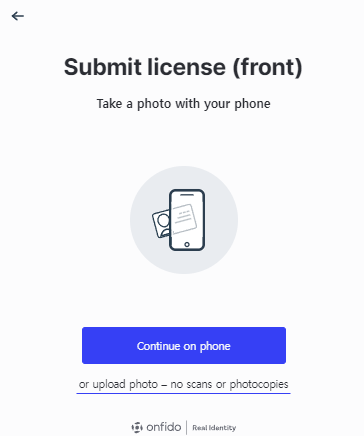7) 면허증을 고르고 "Continue on Phone"을 누르면 사진은 스마트폰에서 촬영 후 업로드하라고 알려줍니다.