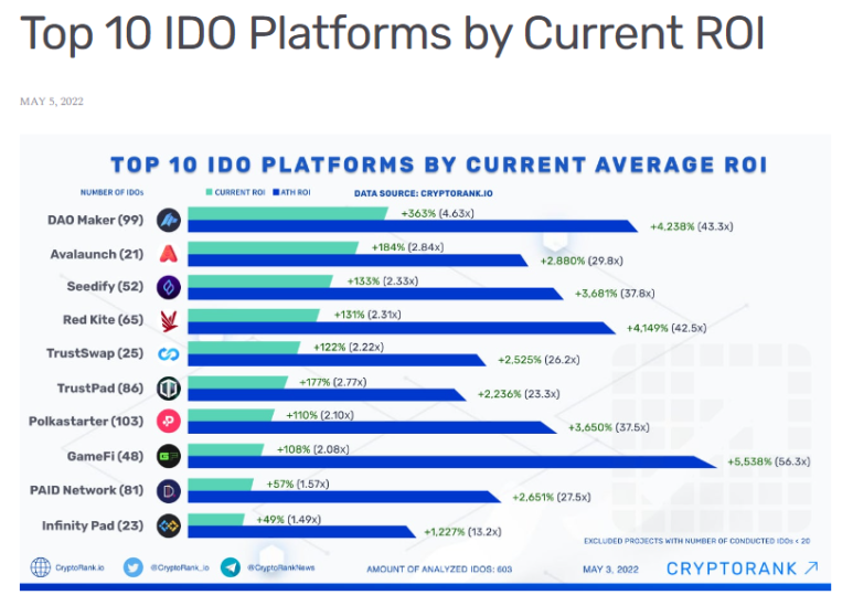 2022년 5월 자료 기준 IDO 갯수와 ROI 측면에서 다른 경쟁 플랫폼 보다 좋은 퍼포먼스를 보여주는