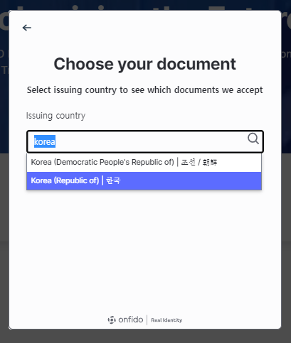 6) Korea라고 입력하면 여권, 운전면허증, 주민등록증 3가지를 받아준다고 알려줍니다.