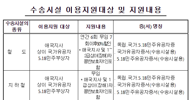 기존 국가 유공자에 대한 지원 내용을 보면 철도의 경우 연간 6회 무임, 7회 이후 50% 할인입니다.