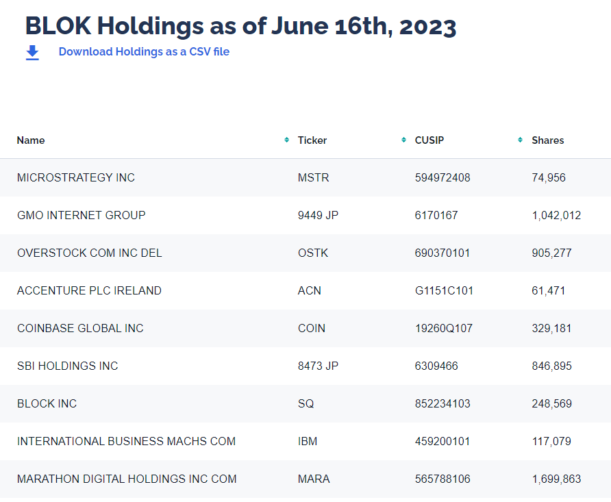2) BLOK은 블록, 마이크로스트레트지 , 코인베이스, SBI홀딩스, 마이크로스트래티지, 라이엇블록체인등