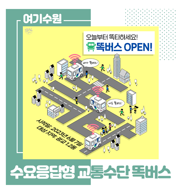 23년 6월 7일부터 수원 광교1동과 2동에서 신개념 교통수단 똑버스(DRT) 운행을 시작하였습니다.. 똑버스가 무엇인지, 어떻게 사용하는지 알아보도록 하겠습니다.