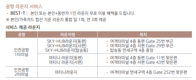 국제 브랜드와 등급에 따라 제공되는 라운지 종류 및 혜택이 다르므로 자세한 내용은 카드명 아래의 바로가기 링크나 2번 서비스 가이북과 3번 라운지 정보 참고 부탁드립니다.