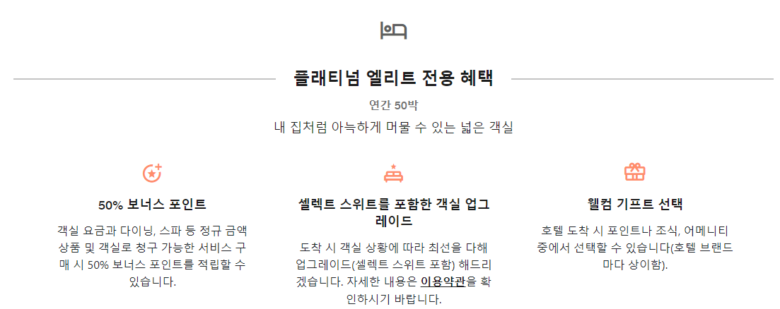 호텔 숙박, 호텔 티어 (엘리트 멤버쉽), 호텔 조식, 공항 라운지, 발레파킹 등을 여행을 위한 서비스가 가득한