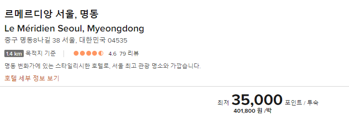 본인 포인트가 있다면 최대 1.5만원을 더해 최대 5만 포인트 호텔의 숙박을 예약할 수 있습니다.