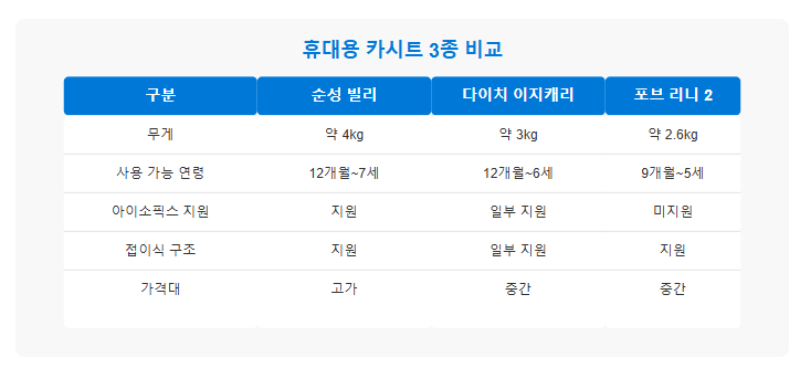그림 설명: 휴대용 카시트 3종의 주요 사양 비교 차트