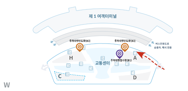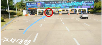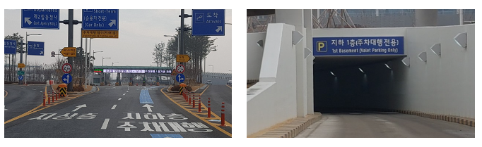 진입 시에는 터미널 주차대행 전용차선으로 진입합니다. (파란색 바닥라인 표시)