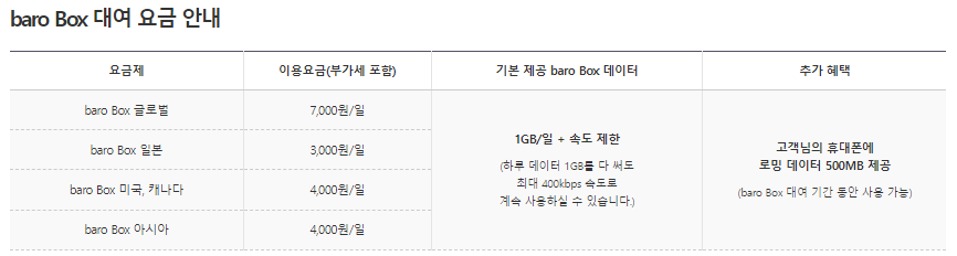 특징 : Baro box 일본의 경우 일 3000원에 1GB + 소진 시 400kbps 무제한 사용가능합니다. 500메가 이용가능한 로밍 데이터를 추가로 제공하여 대여기간 동안 이용가능합니다.