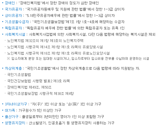 1) 대상 : 주거용 주택용 사용가구 중 장애인, 국가유공자, 상이유공자, 기초생활수급자, 독립유공자, 사회복지시설,
