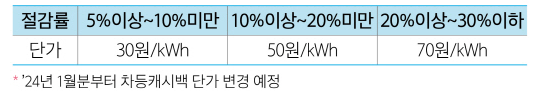 절감률 구간별로 1kWh당 30원-70원 차등 지급합니다. (차등 캐시백)