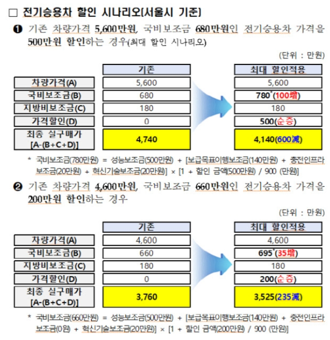 | 1. 680만원에서 780만원으로 최대 100만원을 더 보조해주겠다 2. 할인대상은 단 5700만원 미만의 전기 승용차에 해당한다. 3. 단 100만원은 제조사의 할인금액에 비례해 국비 보조금을 차등하겠다. 4. 보조금 지원안은 2023년 연말까지만 적용한다. |