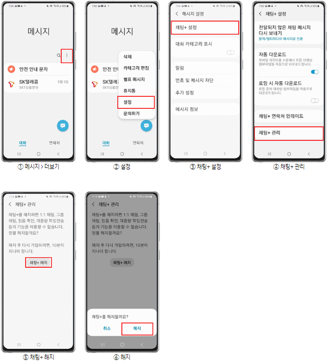 2) 해지 : 메시지 > 더보기 > 설정 > 채팅+ 설정 > 채팅+ 관리 > 채팅+ 해지