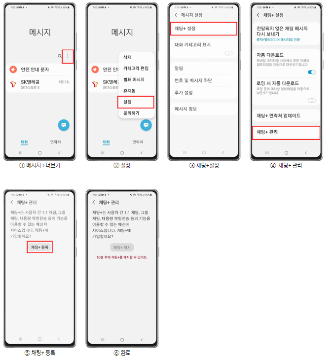 1) 가입 : 메시지 > 더보기 > 설정 > 채팅+ 설정 > 채팅+ 관리 > 채팅+ 등록