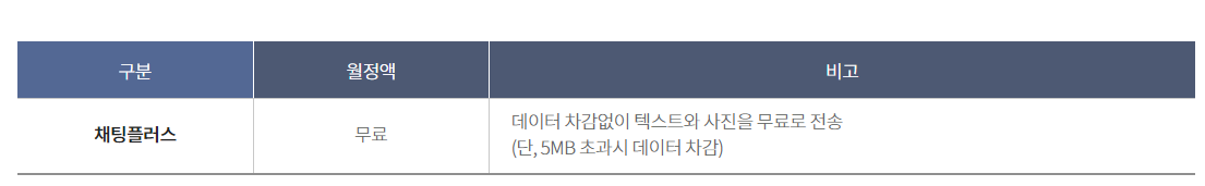 통신 3사 모두 무료라고 표시하고 있습니다. 대부분의 요금제에서 채팅 플러스는 무료로 제공하고 있습니다.