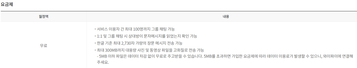 포함되어 있으며 기존에 사용하고 있는 메시징외 파일 전송(100 MB) 및 그룹 채팅 (100명)을 제공하고 있습니다.