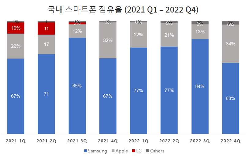국내의 경우 삼성전자 스마트폰 점유율이 60%대 이상입니다. 2021년 LG 전자가 스마트폰 사업을 철수하기 이전 일부 모델 역시 채팅+를 지원하였고 스마트폰에 기본 탑재 되어 있으므로 절반 이상의 국내 사용자는 채팅+ 사용이 가능합니다.