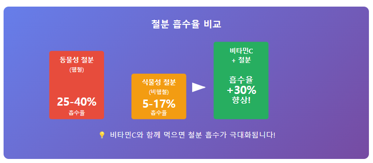 철분에는 두 종류가 있어요. 동물성 식품의 헴철(25-40% 흡수)과 식물성 식품의 비헴철(5-17% 흡수)입니다. 채식 위주 식단이라면 비타민C 조합이 더욱 중요해집니다!