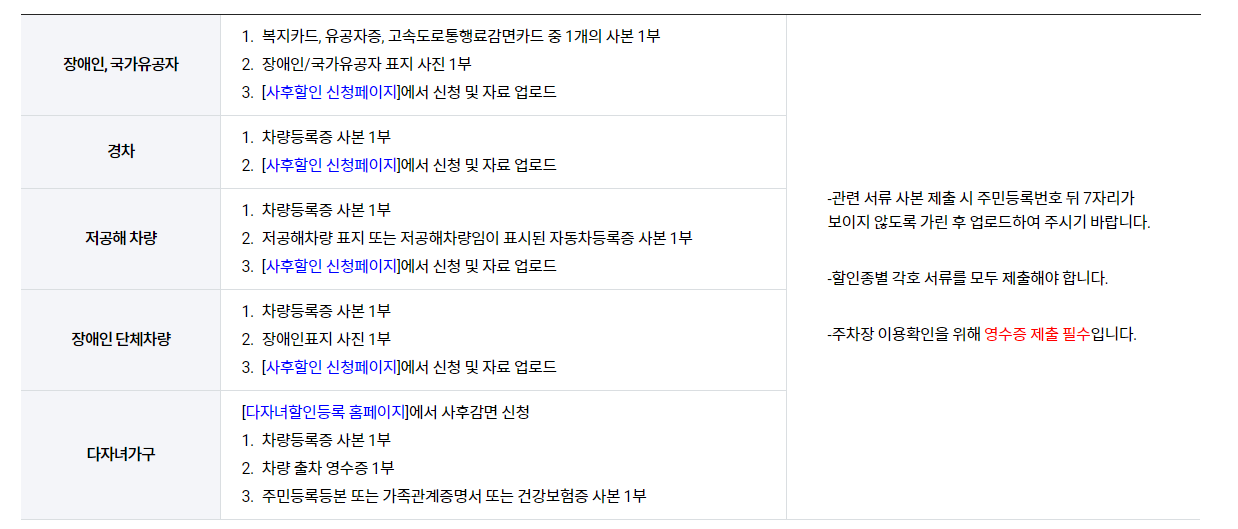 출발 전 주차 현황 및 할인 서류를 꼭 확인해 주세요