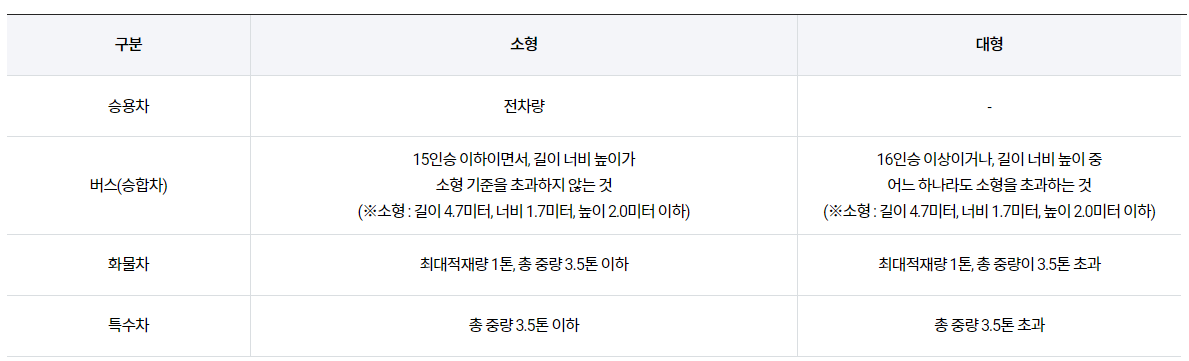 - 소형: 길이 4.7m, 너비 1.7m, 높이 2.0m 이하