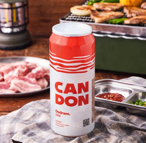 캔돈 삼겹살은 도드람이 2024년 6월에 출시한 축산물 업계 최초의 캔 형태 포장 삼겹살입니다. 기존의 사각형 포장(MAP)팩과는 완전히 다른 혁신적인 아이디어로 캠핑족과 MZ세대를 사로잡았죠.