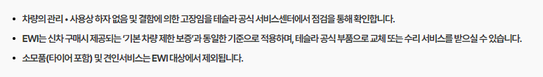 1. 가입 조건 : 테슬라 코리아를 통해 판매된 차량 중 기본 차량 제한 보증의 보증기간 (4년 또는 80,000km) 만료 이전 차량 에 한합니다.