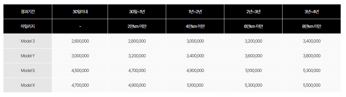 테슬라 기본 차량 제한 보증이 만료되는 날 (4년 이내 / 80,0000km 선 도래 기준)의 익일부터 4년 혹은 80,000km 중 선 도래하는 시점까지 서비스를 받으실 수 있습니다