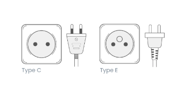 - E형 플러그는 C형과 비슷하지만, 접지 기능을 위해 추가적인 구멍이 중앙에 위치해 있습니다. 프랑스에서는 E형 소켓이 흔하지만, 대부분의 경우 C형 플러그도 호환됩니다.