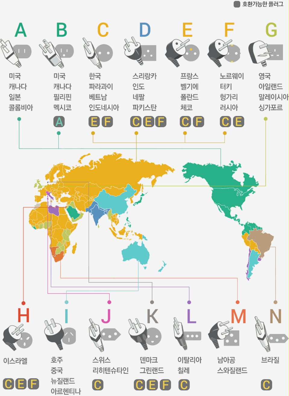 위에서 설명드린 호환가능한 플러그를 사용하는 국가를 제외한 나머지 국가는 멀티어댑터를 준비하셔야 합니다.
