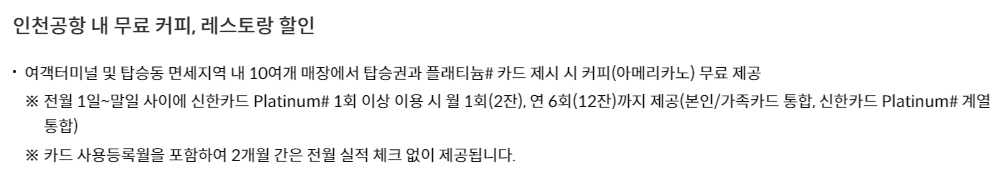 신한카드 Platinum# 기능이 있는 RPM 카드와 AMEX 플래티넘 등급의 카드들은 인천공항 무료 커피 서비스를 제공하고 있습니다.