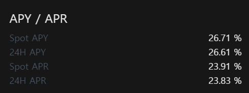 한달 예상 이자는 26% APY 기준으로 (2만개 * 26%) / 12 = 430개 * 35원 = 15000원입니다.