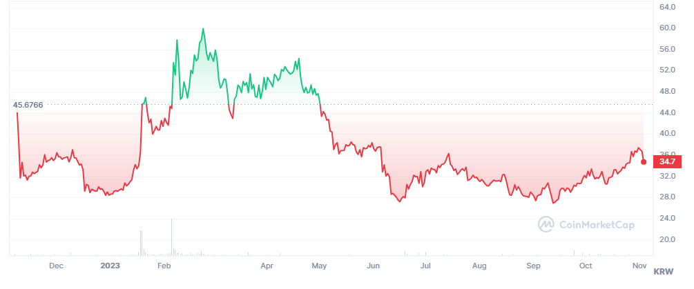 가격은 처음 듀얼 채굴을 위해 구입할 당시 35원대였으나 50원대를 찍고 다시 내려왔습니다.