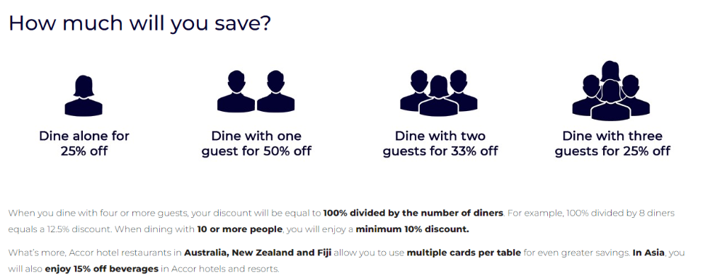 호주, 뉴질랜드 및 피지의 Accor 호텔 레스토랑에서는 한 테이블 당 여러 카드를 사용하여 더 큰 할인 혜택을 누릴 수 있습니다. 아시아 지역에서는 Accor 호텔과 리조트에서 음료에 대해 15% 할인 혜택도 누리실 수 있습니다.