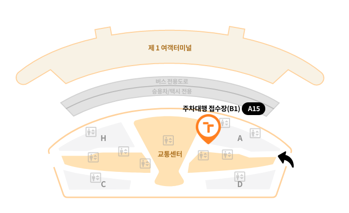 제1터미널의 발렛파킹단기주차장 지하 1층 A15번 구역에서 이용할 수 있습니다. 차량 인계 후에는 카카오톡 혹은 문자로 차량 보관증을 받게 되며, 이 보관증은 귀국 시 반드시 필요하니 잘 보관해야 합니다. 픽업 시에는 도착층(1층)의 지정된 장소에서 차량을 인수받을 수 있어 귀국 피로감을 줄여줍니다.