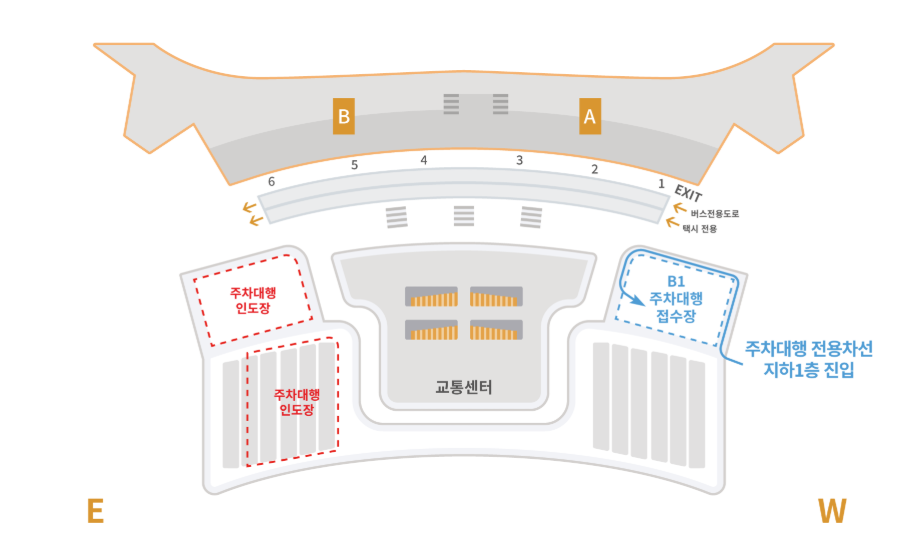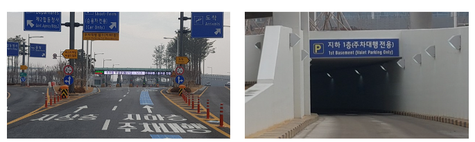 진입 시에는 터미널 주차대행 전용차선으로 진입합니다. (파란색 바닥라인 표시) 단기주차장 지하 1층 진입 후 가장 우측으로 진입합니다.