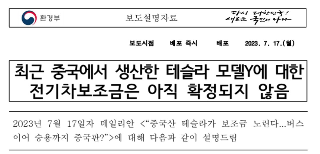 아직 미국산 모델 Y 보조금만 업데이트되어 있고 상하이 생산모델에 정보는 업데이트되어 있지 않습니다. 다만 환경부는 중국에서 생산된 저렴한 테슬라 전기차 모델 Y가 전기차 구매 보조금을 전액 받을 수는 없을 것이라고 설명을 내놓았습니다. 현재 환경부에서 '전기차 보급 대상 평가'를 진행 중이므로 아직 정해진 것은 없습니다.