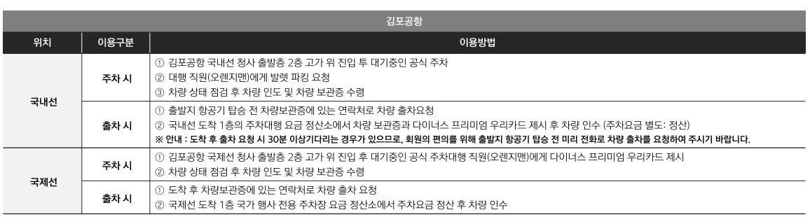 이용조건 : 국내공항 발렛 파킹과 특급 호텔 발렛 파킹 통합 월 3회/ 연 10회 제공