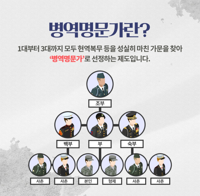 병역명문가는 3대(代)에 걸쳐 모든 남성 구성원이 현역복무를 성실히 마친 가문을 국가가 공식 인정하는 명예로운 제도입니다. 2004년부터 병무청에서 시행하고 있으며, 현재까지 6,813가문, 23,237명이 선정되었습니다.