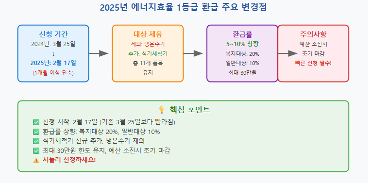 2025년 에너지효율 1등급 가전 환급 정책이 대폭 개편되었습니다. 신청 기간 단축, 대상 제품 변경, 환급률 상향 조정 등 여러 변화가 있어 꼼꼼히 확인이 필요합니다.