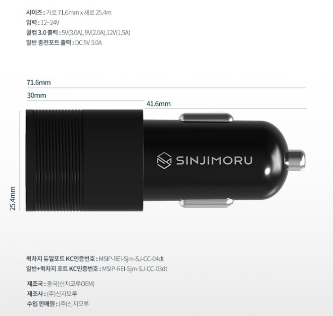 | 제품명 | 신지모루 퀵차지 3.0 듀얼 고속 차량용 충전기 |