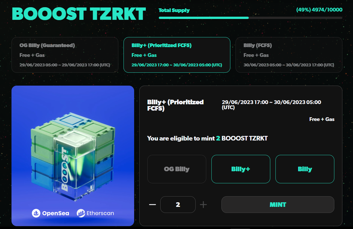메타마스크 지갑 연결하면 본인의 민팅 개수가 표시됩니다. 저는 Billy+와 Billy 두 개를 가지고 있어 민팅 가능 갯수도 2개입니다.