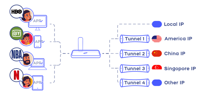 앱별로 멀티 노드 설정 및 라우팅이 가능합니다. (ex: 네이버 -> 로컬, 넷플릭스 -> 미국)