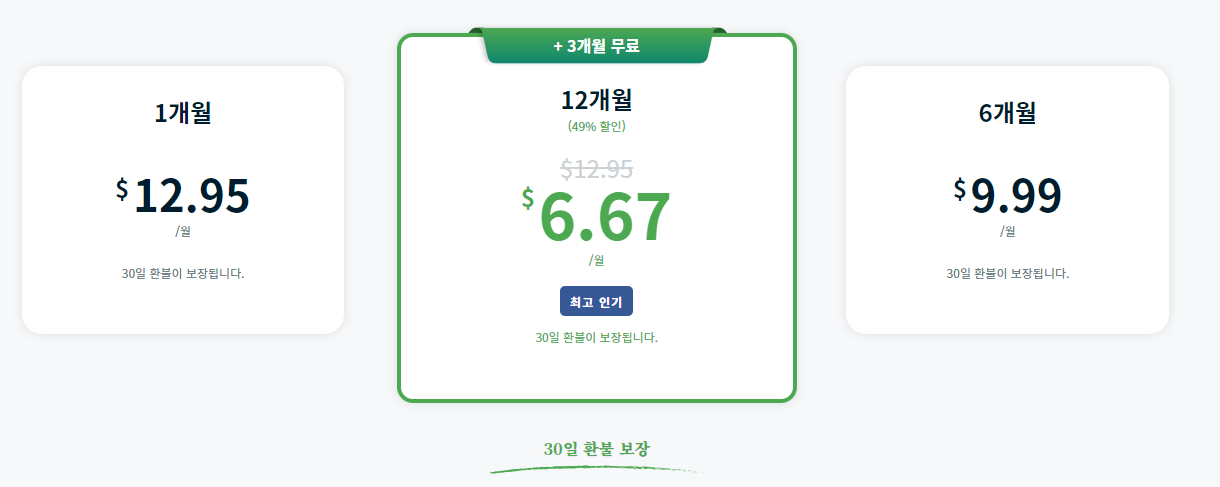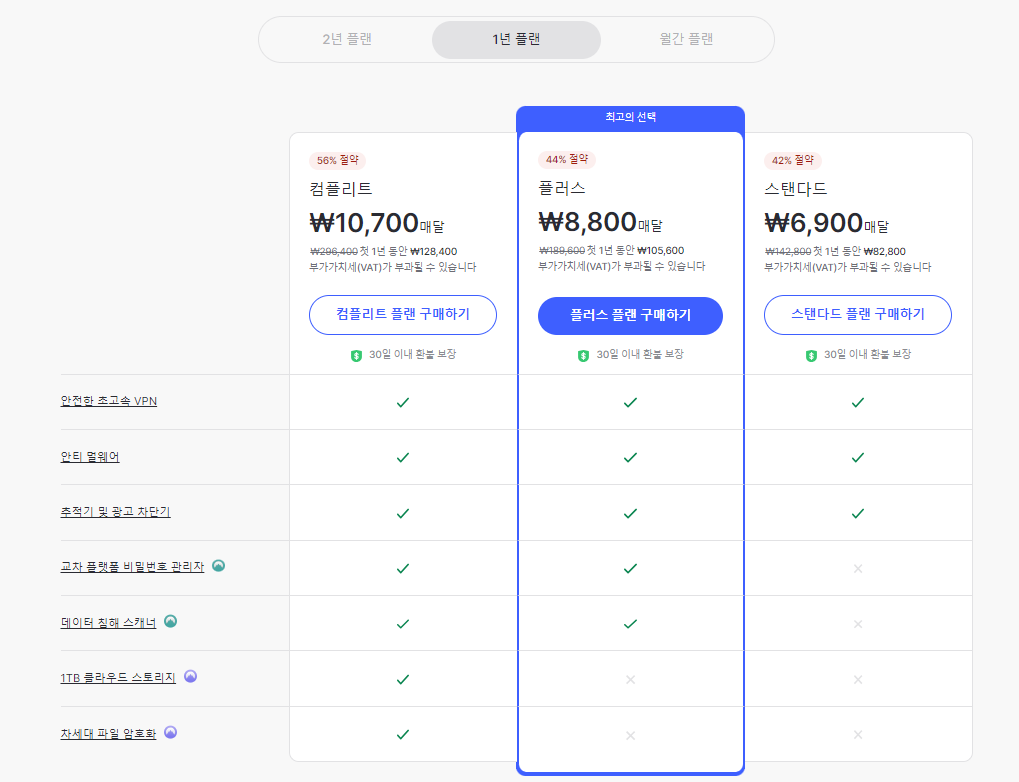 구독은 월간, 1년, 2년플랜의 기간 선택과 보안 패키지유무에 따라 다양한 가격을 제공하고 있습니다.