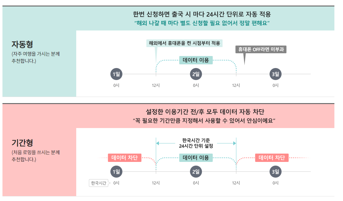 - 자동형 : 해외 도착하여 휴대폰을 켠 시점부터 24시간 단위 부과 (단, 최초 가입 시에는 고객이 설정한 시작 시간부터 부과)