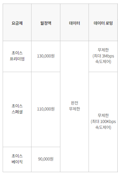 데이터 로밍 무제한 : 초이스 프리미엄은 최대 3Mbps, 초이스 스페셜/초이스 베이직은 최대 100Kbps 데이터 속도로 이용 가능합니다.